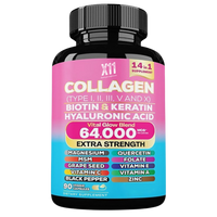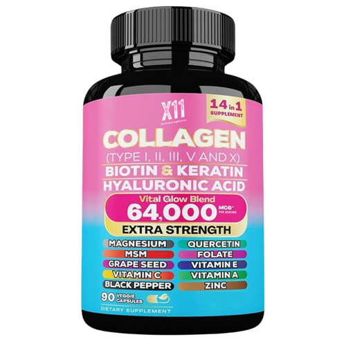 Discover the transformative power of our 14-in-1 Collagen Complex, delivering 64,000 mcg per serving with 30 servings of comprehensive beauty support. Each package contains 90 veggie capsules packed with 14 potent ingredients, including collagen, biotin, keratin, and hyaluronic acid, all essential for nourishing your skin, hair, and nails.