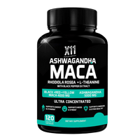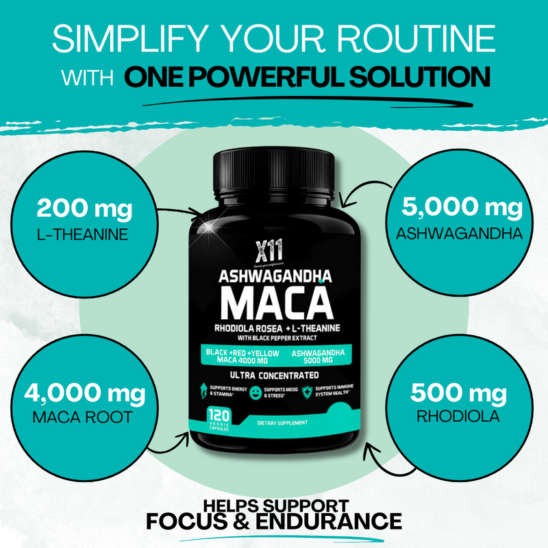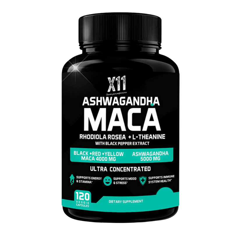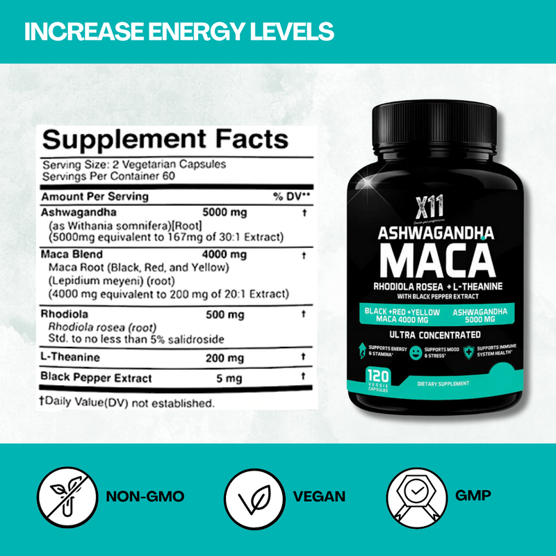 Unlock the benefits of our Ashwagandha with Maca Capsules, designed to support stress relief and overall vitality. Each bottle contains 60 capsules, providing 30 servings with a powerful blend of 5,000 mg of ashwagandha, 4,000 mg of maca root, 500 mg of rhodiola, and 200 mg of L-theanine per serving.