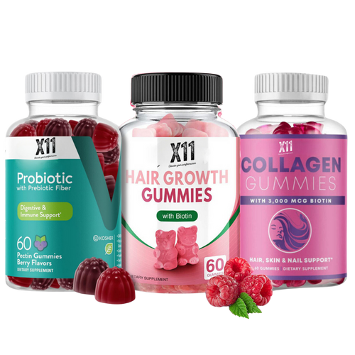 This 3 Pack Bundle is great for strengthening hair and promoting growth, enhancing skin hydration and elasticity, supporting nail strength and resilience, and promoting gut health and wellness. Elevate your beauty and digestive health today with our 3 Pack Collagen, Biotin & Probiotic Keto Gummies Bundle, and experience the synergy of these powerful supplements!