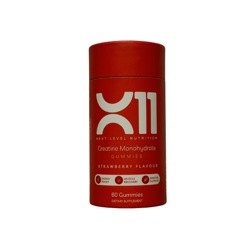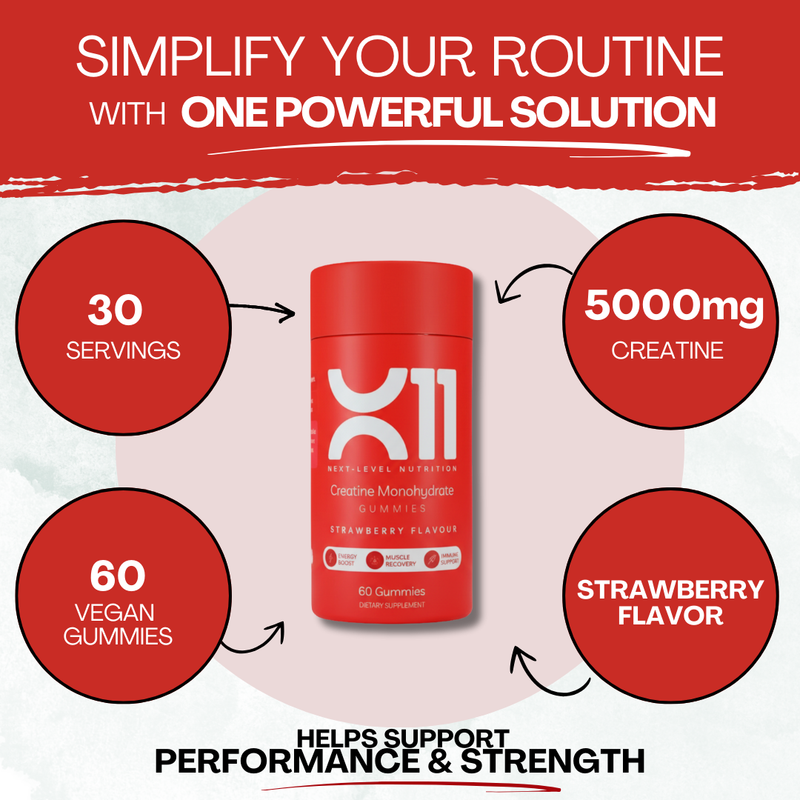X11 Vegan Creatine Gummies deliver a clinically effective 5000mg dose of creatine monohydrate per serving, in a convenient strawberry-flavored gummy.