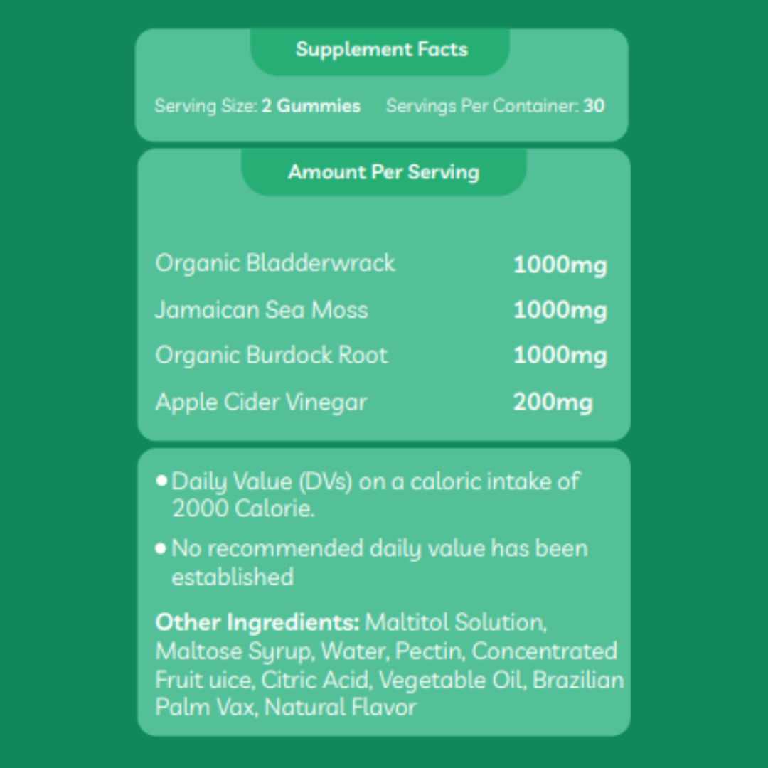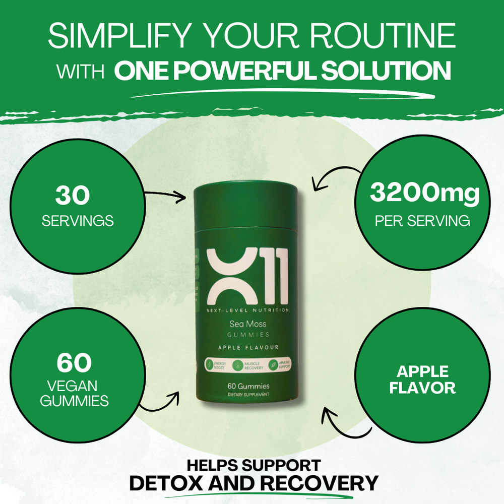 Our X11 Vegan Detox Gummies are crafted for fitness-minded individuals seeking natural immune support, improved gut health, and clean detox supplementation. With a potent 3200mg blend of Sea Moss, Bladderwrack, Burdock Root, and Apple Cider Vinegar, this daily gummy is made to support performance, digestion, and recovery — no pills, no compromises.